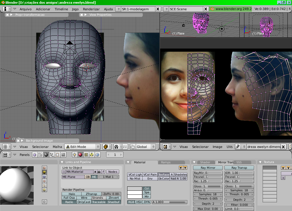 Modelo 3d ainda em faze de modificação estará pronto em breve para download, mas primeiramente estou fazendo a animação deste modelo, animações da boca, olhos e outras partes do rosto. Enquanto não crio uma textura digital para ela, fiz o mapeamento com a sua própria "photo textura"